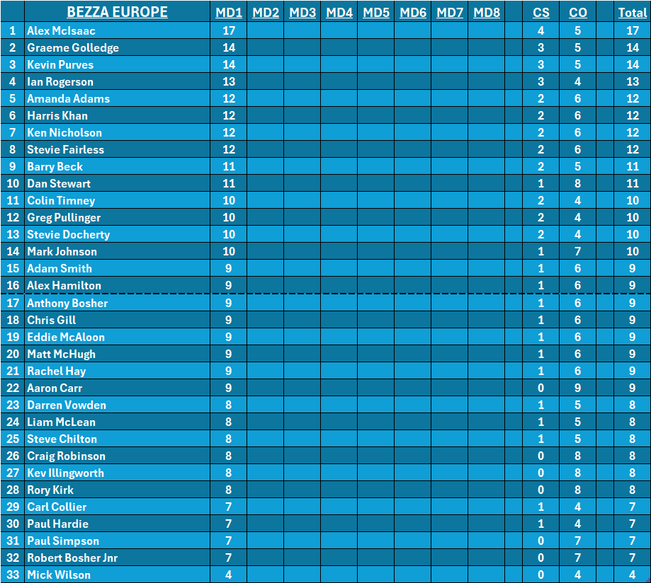 Bezza Europe got off to a high scoring start with Alex McIsaac scoring 17 points to take an early lead after matchday 1. McIsaac predicted 4 correct scores and 5 correct outcomes to lead by 3 points. In second with 14 points were debutant Graeme Golledge and Kev Purves, with Ian Rogerson in third on 13 points.