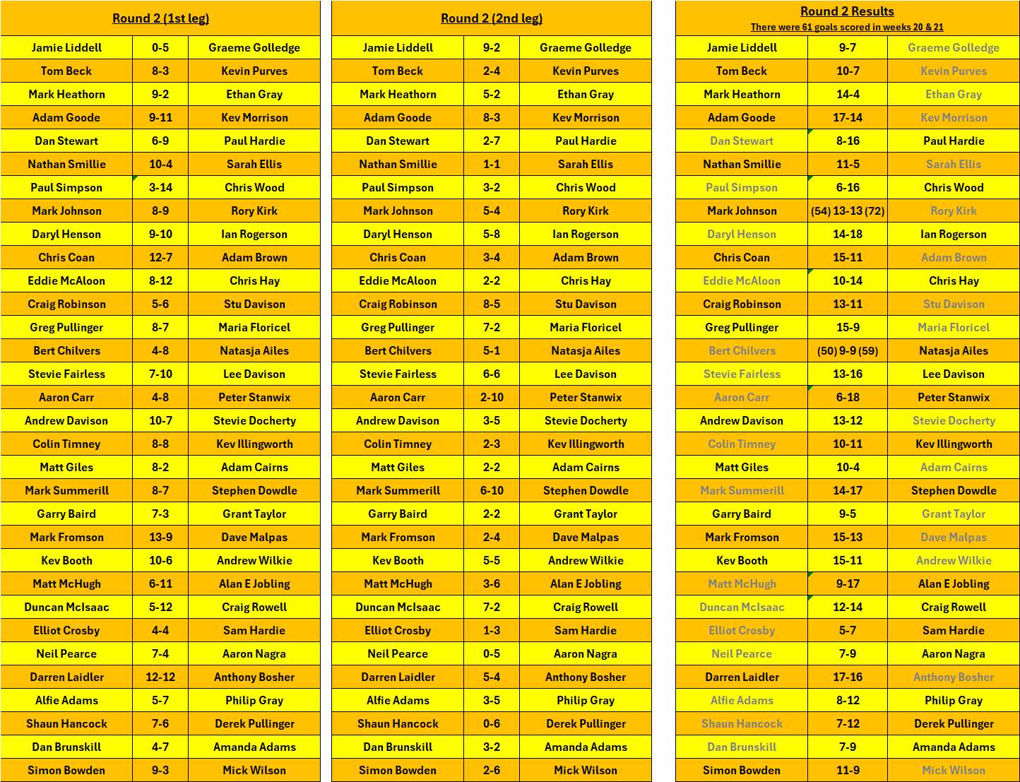 There were 61 goals scored on weeks 20 & 21 – any tied matches go to total goals predicted shown in the brackets.