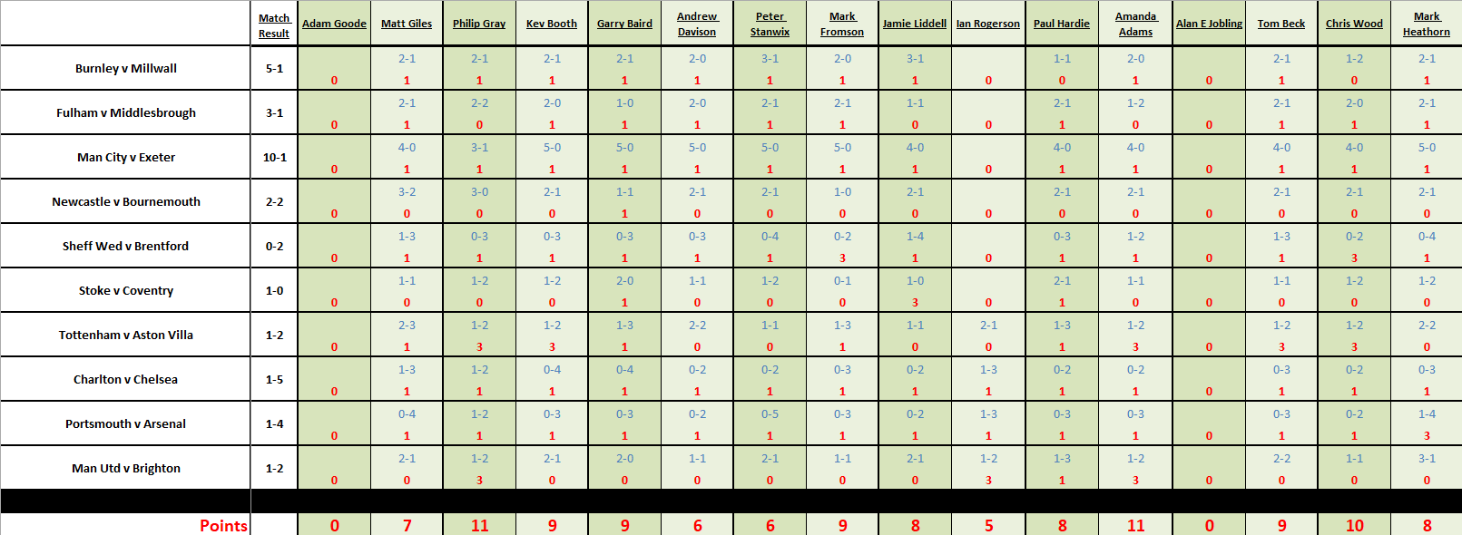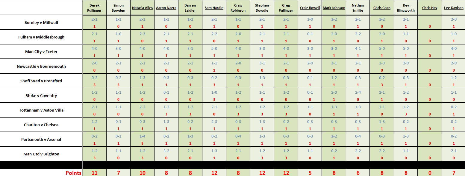 There were 45 goals scored on weeks 18 & 19 – any tied matches go to total goals predicted shown in the brackets.